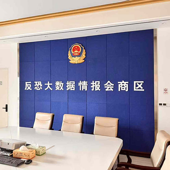 青島反恐大數(shù)據(jù)情報(bào)會(huì)商區(qū)logo墻設(shè)計(jì)制作中發(fā)泡板烤漆字的制作?
