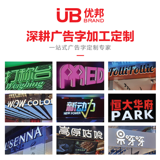 青島優(yōu)邦廣告字制作公司是一家集廣告產(chǎn)品的設(shè)計(jì)、制作、發(fā)布為一體專業(yè)化廣告公司。在廣告工程、廣告設(shè)計(jì)、廣告制作、廣告發(fā)布、照明工程領(lǐng)域中積累了豐富的行業(yè)經(jīng)驗(yàn)。公司擁有一整套大型亞克力成型設(shè)備、雕刻機(jī)、LED燈飾產(chǎn)品、霓虹燈等專用設(shè)備,以及一批業(yè)務(wù)精通、經(jīng)驗(yàn)豐富、技術(shù)嫻熟、責(zé)任心強(qiáng)的設(shè)計(jì)、制作、安裝一體的專業(yè)隊(duì)伍。