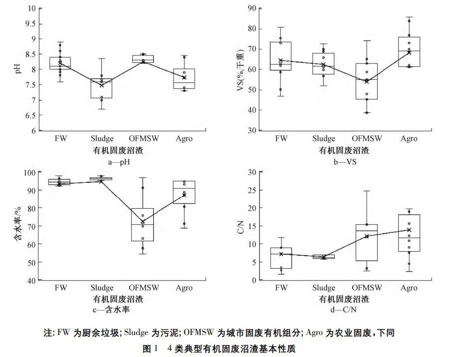 本文通過文獻調研與項目采樣,共統計了238個全球正式運營的大中型厭氧處理廠(處理量>50t/d)數據,針對廚余、市政污泥、農業固廢、與城市固廢有機組分4類典型進料物的沼渣,分析其基本性質、營養物及重金屬含量并進行對比。在調研中,廚余沼渣部分數據來自文獻[8-16],市政污泥的沼渣部分數據來自文獻[9,17-25],農業固廢的沼渣部分數據來自文獻[12,13,16-30],城市固廢有機組分的沼渣部分數據來自文獻[9,25,31-35],另外,將實際運營的有機固廢厭氧處理廠的采樣分析作為各類沼渣數據的補充(此數據來自業界工程項目,未經公開發表)。參考GB/T19095—2019《生活垃圾分類標志》,本文中廚余(foodwaste,FW)表示易腐爛、含有機質的經分類后的生活垃圾,包括家庭廚余垃圾,餐廚垃圾和其他廚余垃圾;污泥(Sludge)特指城鎮污水處理廠在污水凈化過程中產生的市政污泥;農業廢物(Agro)包括各類畜禽糞便與植物纖維性廢棄物2類;而城市固廢有機組分(organic fraction of municipal solid waste,OFMSW)包括庭院垃圾、雜草枯葉、花卉殘枝、家庭廚余與果蔬垃圾。本文分析了厭氧消化后未經固液分離的沼渣,數據采用“平均值±標準方差”表示,標準方差越大,表示范圍分布越廣。