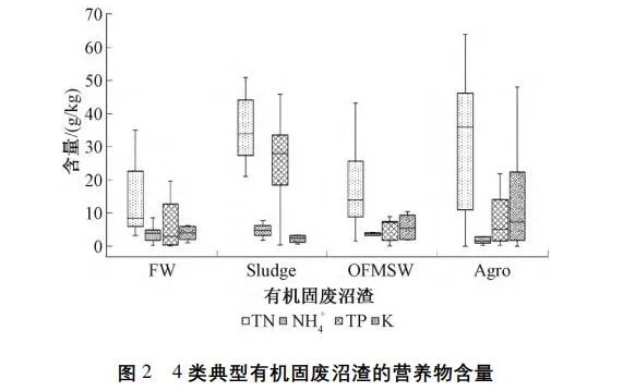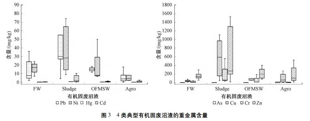 氮、磷、鉀是沼渣主要營養物成分,是肥效作用的關鍵元素,而氨氮濃度可作為植物毒性與養分徑流的指標。由圖2可知:4類沼渣營養物含量具有明顯差異,廚余與城市固廢有機組分的沼渣總氮含量的平均值相近(18.5g/kg與18.2g/kg)且低于污泥與農業固廢沼渣(32.9g/kg與35.7g/kg)。通常土壤氨氮控制目標值為9.2g/kg,以避免氨氮植物毒性,而4類沼渣的氨氮濃度主要為3~5g/kg,引起植物毒性的可能性較小。污泥沼渣的總磷含量的平均值高達35.7g/kg,遠高于廚余(6.6g/kg)、城市固廢有機組分(5.0g/kg)與農業固廢(7.9g/kg),主要原因是市政污水中的磷富集在污泥中,厭氧消化過程中隨著微生物的分解衰減,超過80%(質量分數)的生物結合磷被重新釋放到液相中,導致了污泥沼渣的較高的磷含量。而土壤的前端鉀肥施用導致末端農業固廢沼渣的鉀含量較高(15.0g/kg),其平均值明顯高于其他種類沼渣(廚余沼渣:5.7g/kg;污泥沼渣:2.8g/kg;城市固廢有機組分:5.9g/kg)。基于以上歸納,若采用沼渣堆肥土地利用的技術路線,需考慮各類沼渣的主要養分(如通常污泥沼渣富含氮磷,農業固廢沼渣富含鉀,而廚余與城市固廢有機組分的沼渣養分含量較為均衡),因地制宜地施用沼渣堆肥后的產品。