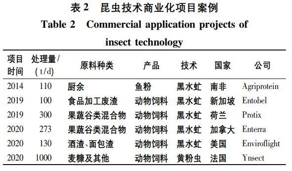 有機固廢沼渣富含大量營養物質,具備資源化潛質。昆蟲轉化技術作為近幾年的新興技術,將有機固廢轉化生產高價值產品,實現全鏈條資源化(圖4c)。例如,黑水虻將有機固廢作為食物,在體內消化并合成高含量的粗蛋白(40%干重)與粗油脂(30%干重),具有較高的商業價值。但就昆蟲轉化而言,物料的選擇是成功的關鍵環節。當污泥沼渣作原料時,黑水虻需要漫長的時間進行生物轉化(40d),遠長于果蔬垃圾為原料的轉化時間(10d)。除Agriprotein公司利用廚余為原料之外,其他公司均以果蔬、谷類、食品加工廢渣作為原料生產動物飼料(表2)。此外,國際昆蟲食品飼料協會(International Platform of Insects for Food and Feed,IPIFF)將餐飲垃圾、畜禽糞便、含魚肉類食品列為昆蟲轉化技術的禁用原料。而加工類廢渣如麩皮、麥糠、酒渣、奶渣、果蔬垃圾的源頭可溯相對“安全”,推薦采用昆蟲技術。目前,全球處理量最大的是法國Ynsect公司采用的黃粉蟲技術,每天處理1000t麥糠及其他輔料,且昆蟲轉化工藝的末端殘渣富含腐殖酸,烘干后可作為有機肥料或土壤改良劑使用。近些年,昆蟲技術在我國迅速發展,主要應用于廚余垃圾三相分離后的有機固渣處理,然而如何實現機械化養殖與運營是昆蟲技術在我國發展的瓶頸(尤其是蟲卵、蟲糞、幼蟲的精準篩分)。另外,鮮蟲或干蟲的消納渠道是決定昆蟲技術是否盈利的關鍵,根據Eawag在印度尼西亞的黑水虻生產測試線調研報告,相比養殖場飼料,將干蟲或鮮蟲作為家庭寵物飼料更為適合,更加利于建立全鏈條資源化產業鏈。