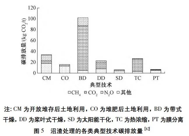 沼渣處理是一個排放CO2(eq)的過程,其能量消耗可通過二氧化碳當量(CO2(eq))核算。不同處理手段的沼渣處理過程碳排放排序為:帶式干燥(100kgCO2/t)>開放堆存利用(38kgCO2(eq)/t)>熱濃縮(24kgCO2(eq)/t)>槳葉式干燥(21kgCO2(eq)/t)>堆肥利用(18kgCO2(eq)/t)>膜分離(10kgCO2(eq)/t)>太陽能干化(6kgCO2(eq)/t)(圖5)。沼渣干化工藝的選擇影響著碳排放量:帶式干燥的耗電量大,且過程中大量的氮源流失,導致其土地利用價值較低、碳排放較大;而太陽能干化通過利用太陽能輻射轉化能量,極大減少了碳排放。若沼渣進行土地利用,營養物質具備碳減排效益,沼渣代替肥料可實現碳補償-20~-28kgCO2(eq)/t。相比之下,沼渣焚燒的碳排放為95~100kgCO2(eq)/t。就新興資源化技術而言,昆蟲轉化工藝的碳排放較少(約30kgCO2(eq)/t),僅為焚燒工藝的30%,但針對沼渣的昆蟲轉化技術仍處在研究階段。尚無沼渣高值碳化(HTL)與生物干化過程的碳排放的研究報道。